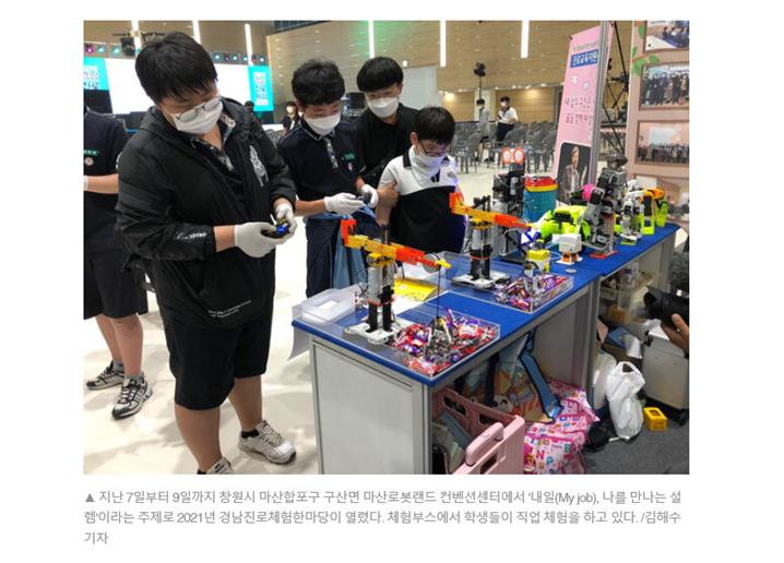 지난해 코로나19 확산에 비대면 행사로 열린 경남진로체험한마당이 2년 만에 학생들과 직접 만났다. 체험 부스 규모는 다소 줄었지만, 감염병 위험 탓에 진로 탐색과 직업 체험 기회가 줄어든 상황에서 학생들이 직접 참여해 보고 느낄 수 있는 자리를 마련했다는 점에서 좋은 평가를 받았다.지난 7일부터 9일까지 마산로봇랜드 컨벤션센터에서 '내일(My job), 나를 만나는 설렘'이라는 주제로 2021년 경남진로체험한마당이 열렸다. 개막식, 토크콘서트 등 이번 행사 주요 프로그램들은 공식 누리집(gnjinro.com)과 유튜브 채널로 생중계됐다.